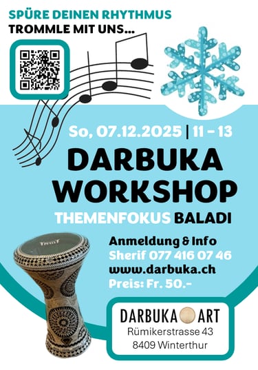 In unseren Workshops tauchst Du tiefer in die Welt der Darbuka ein. Gemeinsam musizieren wir in einer offenen, kreativen Atmosphäre und widmen uns jeweils einem spezifischen Thema.
